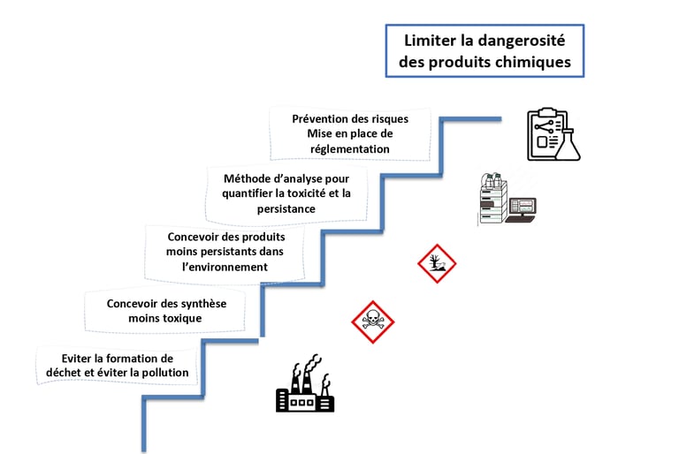 Le premier axe de la chimie verte peut se schématiser comme un processus menant à limiter la dangerosité des produits chimique. Chacune des marches du processus est essentiel pour arriver cet objectif. La première étape, la plus évidente, est de limiter la pollution. La source de pollution de l’industrie chimique sont les déchets et rejets. La part en produit fabriqué représente dans certaine industrie une faible quantité par rapport à celle des déchets générés. Le facteur E représente ce rapport. Les produits chimiques de commodité génèrent environ 5 kg de déchets pour 1 kg de produit fini, soit un facteur de E de 5. A l’inverse, les produits pharmaceutiques présentent un facteur E pouvant aller jusqu’à 1000. Les multi-étapes, les co-réactif en excès ou les solvant de purification sont quelques exemples des déchets générés. Certains sont difficilement valorisable car le coût de régénération est généralement plus élevé que celui de destruction.